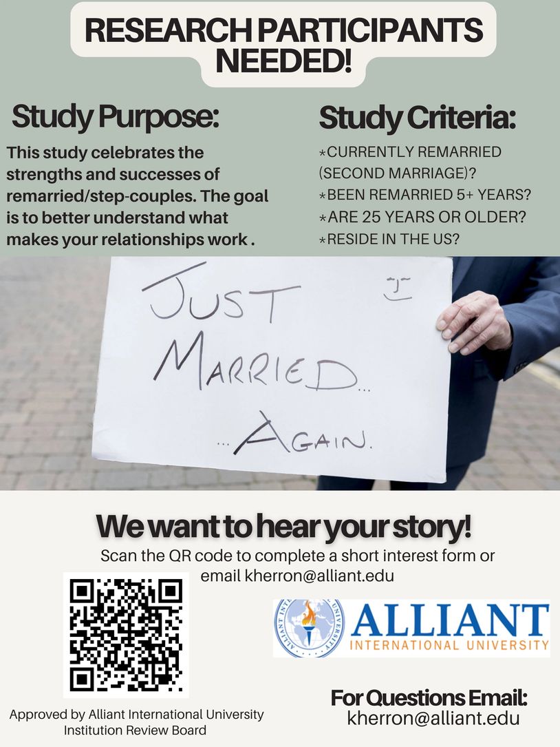 As part of my doctoral dissertation in Couples and Family Therapy at Alliant International University, I am recruiting married step-couples for interviews examining attachment processes, resilience, and marital satisfaction in step-couples.